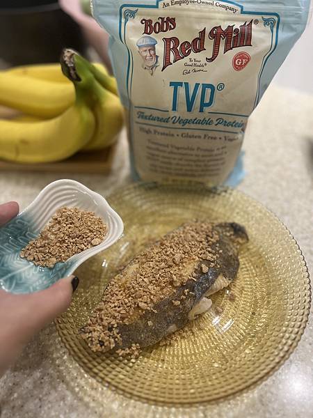 再撒上TVP大豆片就好,可以加一點黑胡椒與鹽更美味!
