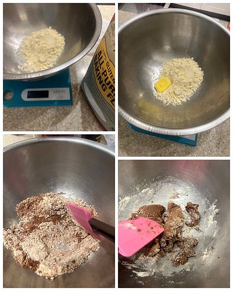 1.粉類過篩後,加入奶油混合。在加入水,扮成麵團。